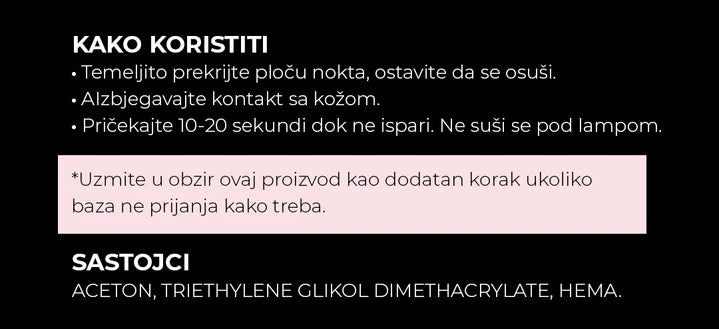 Odmašćuje ploču nokta mijenjajući njezin pH, čime se fiksira i povećava prianjanje proizvoda koje nanosite na ploču nokta. Bolje prianjanje laka dok je hibridni lak na vašim noktima.